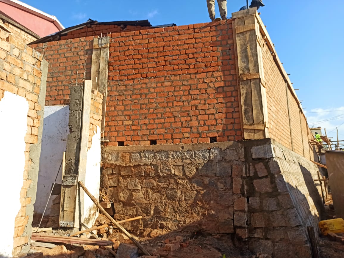 On a commencé par la reconstruction du mur de clôture : démolition du reste du mur existant, décapage et nettoyage du site, implantation, fouille en rigole, terrassement, ouvrages en béton armé (béton de propreté a 150 kg, béton arme dosé a 350 kg, coupe et ligature armature, semelle et poteaux, coffrage), maçonnerie de moellons, maçonnerie de briques. Les travaux de gros œuvre sont terminés a 100%. Il reste ainsi les finitions ou 2nd œuvre.